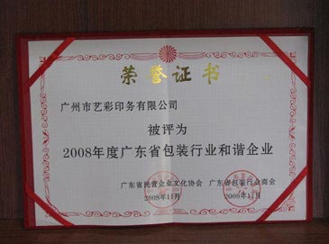 廣州藝彩印務(wù)被評(píng)為:2008年度廣東省包裝行業(yè)和諧企業(yè) 廣東省包裝行業(yè)和諧企業(yè) 榮譽(yù)證書(shū)